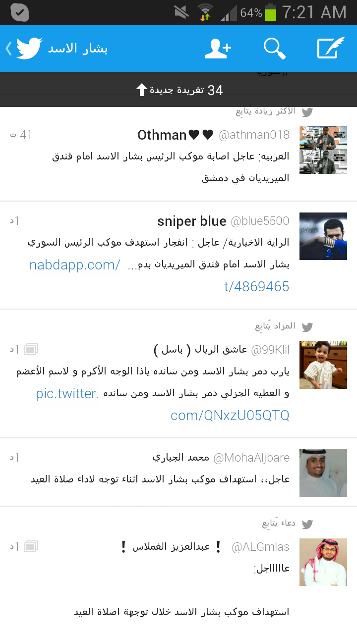 قائد لواء تحرير الشام النقيب المنشق فراس بيطار أكد أستهداف موكب اﻷسد في دمشق بقذائف الهاون دون تحديد مصير الموكب حتى اللحظة وذلك خلال توجه الأسد لتأدية صلاة عيد الفطر المبارك.