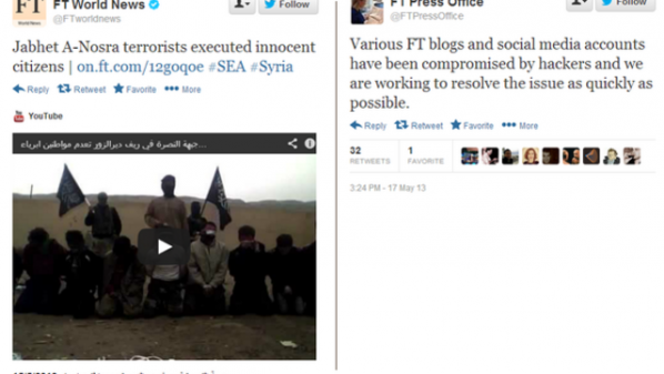 في مسلسل الأختراقات التي يشنها ما يعرف بأسم الجيس السوري الإلكتروني التابع لنظام بشار الأسد في سوريا، فقد قام هذا الجيش بأختراق الموقع الرسمي على الإنترنت والحساب الرسمي لصحيفة “فايننشال تايمز” البريطانية على موقع “تويتر”.