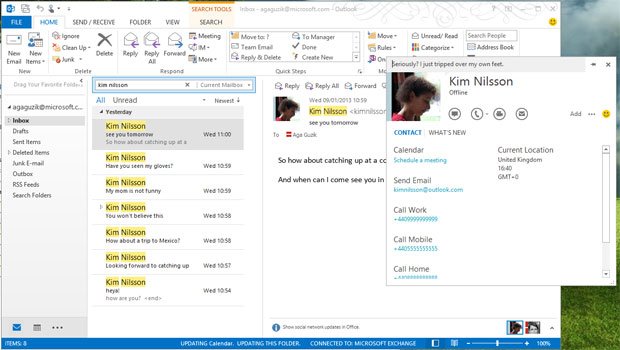 وقد أصبح بإمكان المستخدم الوصول إلى جهات الإتصال الخاصه به على السكايب ومشاهدة حالات اصدقائه وملفاتهم الشخصية وأرقام الموبايلات مباشرة داخل جهات اتصال اوتلوك كما هو موضح في الصوره المدرجة في التدوينة فوق كما يمكنك الإتصال بصديقك مباشرة من الأوتلوك حتى لو لم يكن مسجل في قائمة جهات الإتصال الموجوده بسكايب أو يمكنك أن ترسل له رسالة صوتية أو رسالة فيديو تخبره بها أنك تريد اضافته في حسابك .