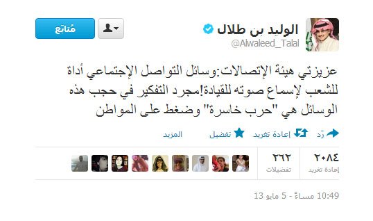 بهذه العبارة أكد الملياردير السعودي الأمير “الوليد بن طلال” في تغريده له على حسابه الرسمي في تويتر أن أي تفكير بحجم وسائل التواصل الأجتماعي في المملكة هي حرب خاسرة ، في إشارة إلى تهديد هيئة الاتصالات وتقنية المعلومات السعودية بحجب برامج وتطبيقات المحادثة المباشرة والاتصال المرئي مثل واتس أب و فايبر وسكايب.