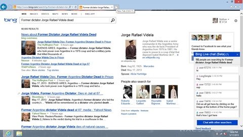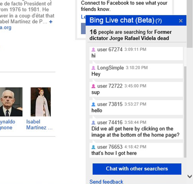 سربت اليوم صورة تبين أن محرك بحث بينج يعمل حالياً على توفير صندوق دردشة مباشر ضمن محرك البحث للأستفادة منه دون مغادرة محرك البحث دون أن تكون مسجل دخولك بحسابك على مايكروسوفت أو سكايب.