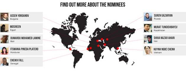 وقد تم تحديد النشطاء التسعة من تسعة دول هي مصر والهندوراس ومصر وإيران وكازاخستان ومالي وروسيا والسنغال وفيتنام، حيث يتم أختيار الفائز عبر التصويت للشخص الذي يعجب المصوت بعد مشاهدة الفيديو الخاص به.