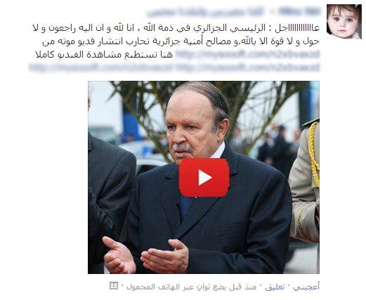 اليوم ينتشر خبر في الفيسبوك حول وفاة الرئيس الجزائري عبد العزيز بوتفليقة، الأمر الذي نحذر منه بشدة هنا هو النقر على الروابط المرافقة لهذا الخبر كونه مجرد دعايات دنيئة لمواقع لا يدخلها أحد وعلى الأغلب تعمل تلك المواقع على نشر الأكاذيب والفيروسات في آن معاً للسيطرة على حواسيب الضحايا وسرقة بياناتهم الشخصية.