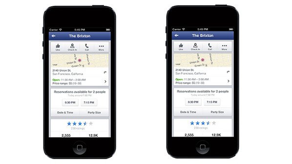 وقالت الشبكة أنه أصبح بإمكان مستخدمي تطبيقات فيسبوك القيام بحجوزات في أكثر من 20 ألف مطعم في أمريكا الشمالية مباشرةً من خلال تطبيق فيسبوك على الهواتف المحمولة.