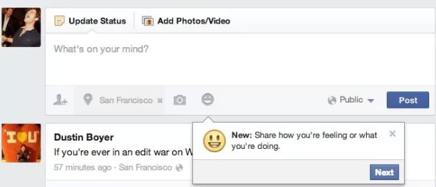 وحين تقوم بكتابة حالة جديدة خاصة بك تجد قائمة مسندلة على شكل زر إلى جانب زر الكاميرا تحتوي على العديد من اشكال الوجوه التعبيرية بين حزين وسعيد أو فرح جداً أو منزعج وتتيح لك تعريف الآخرين بحالتك وقت كتابة البوست الجديد .