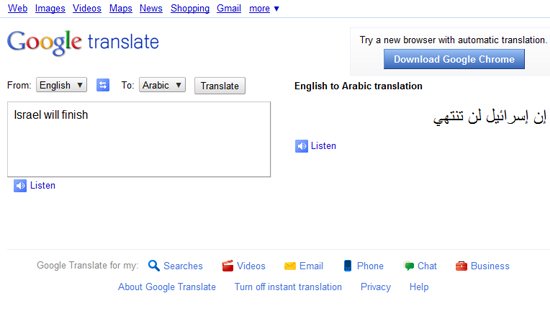 وصلنا هذا الأمر عبر أحد الأصدقاء عبر موقع فيسبوك ، حيث لفت انتبهنا إلى أن ترجمة جوجل تتعمد تغيير ترجمة عبارة واضحة وضوح الشمس وهي كما في الصورة عبارة “Israel Will Finish” .