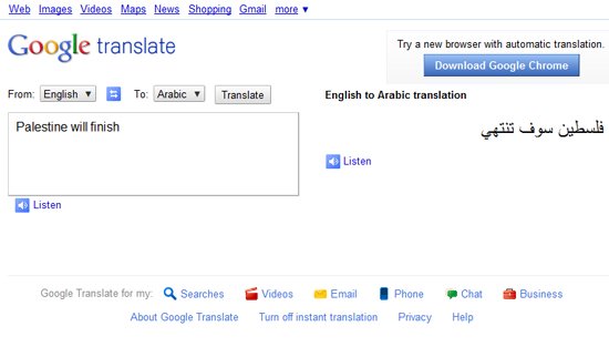 لماذا يا جوجل حين نكتب عبارة “Israel Will Finish” فتكون الترجمة “إن إسرائيل لن تنتهي” . بينما إذا كتبنا عبارة “Palestine Will Finish” فتكون الترجمة صحيحة حيث تظهر عبارة “فلسطين سوف تنتهي” كما في الصورة التالية .