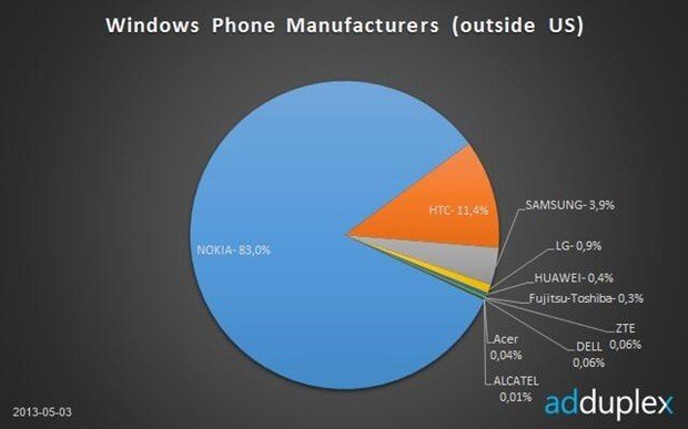 فبحسب الدراسة فأن حصة نوكيا من نظام ويندوز فون بلغت 83% تلتها HTC بنسبة 11% ثم سامسونج بنسبة 3.9% وشركة LG بنسبة 0.9%.