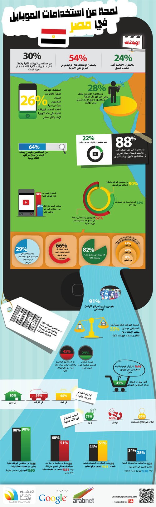 وتابعت الدراسة التي قام بها موقع “عالم أجهزة الجوّال” التابع لشركة غوغل أن 28% من المستخدمين المصريين يتصفحون الإنترنت بشكل يومي باستخدام الهواتف الذكية، بينما 34% من الباحثين عن الأخبار المحلية يُطلعون الآخرين عليها، بينما 28% يبتاعون من خلال أجهزتهم الذكية. من المتوقع أن تقفز نسبة الشراء إلى 46% في المستقبل.