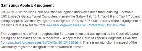 في تاريخ 25 أكتوبر 2012، وضعت آبل إعتذاراً في موقعها البريطاني بخصوص الأجهزة اللوحية من سامسونج. البيان السابق ليس يكن صحيحاً ولا يتطابق مع أوامر المحكمة في انجلترا وويلز.
