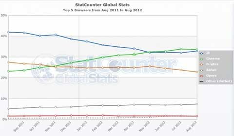 إحصائيات شهر أغسطس/آب الماضي قالت بأن إنترنت إكسبلورر قد نجح بتقليص الفارق محققاً نسبة 32.85% من سوق المتصفحات، بينما تفوق كروم بفارق بسيط وبنسبة 33.59% في تراجع عن الشهر الماضي.