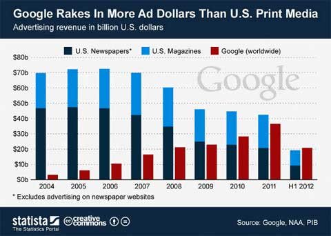 قالت شركة المانية متخصصة في إحصائيات السوق أن عملاق البحث “جوجل” وفي ستة أشهر الأولى من العام 2012 قد حقق ارباحاً وقدرها 10.9 مليار دولار من الإعلانات على الانترنت فقط .