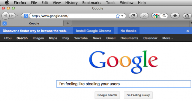 تسعى شركة جوجل الى دعم متفحها الشهير كروم بشتى الوسائل لحصد المزيد من الحصةالسوقية وان كان ذلك بطرق يراها البعض غير نزيهة. فكما تلاحظون في صورة الخبر فان جوجل تقوم بابلاغ مستخدمي محرك بحثها الأشهر عالميا بان متصفحها اسرع من غيره فما رايك بتجربته.
