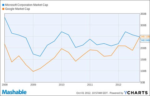 فقد زادت أسهم جوجل بنسبة 0.8% لتصبح قيمتها السوقية 249 مليار دولار مقابل 248 مليار دولار لشركة مايكروسوفت .