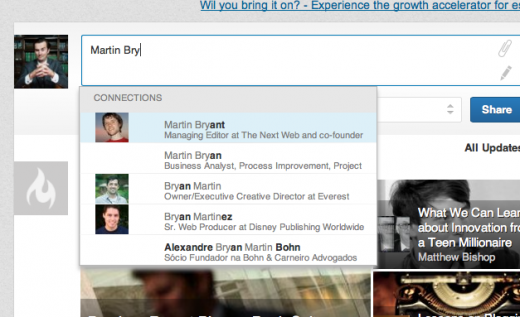 أعلنت شبكة “لينكد إن” للتواصل الاجتماعي للأعمال عن اطلاق ميزة الإشارة Mention والتي تتيح لمستخدميها الإشارة إلى غيرهم من المستخدمين أو الشركات ضمن تحديثات الحالة والمحادثات التي تدور بينهم.