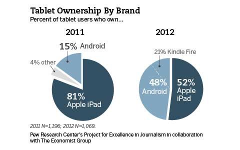 فقد تمكنت الأجهزة اللوحية العاملة بنظام الأندرويد تقليص الفجوة بينها وبين جهاز الآيباد من آبل، حيث وصل نسبة إستحواذ أجهزة أندرويد اللوحية على نسبة 48% منها 21% لجهاز Kindle Fire، بينما إنخفضت نسبة إستحواذ Apple إلى 52%.