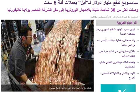 ظهر علينا اليوم خبراً على موقع العربية نت يفيد بأن شركة سامسونج قد دفعت الغرامة المفروضة عليها لصالح شركة “أبل” والبالغة قيمتها مليار دولار أمريكي، على هيئة عملات صغيرة من فئة الخمسة سنتات.