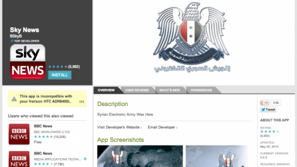 أكدت قناة BSkyB البريطانية الأخبار التي قالت بأن التطبيقات الرسمية الخاصة بالقناة على منصة أندرويد تم أختراقها مؤخراً من قبل ما يعرف بالجيش السوري الإلكتروني الموالي لنظام بشار الأسد .