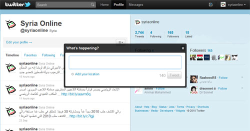 2- تم إضافة زر في التولبار هو إضافة” تحديث” لحسابك وهذا الزر يتنقل معك اينما ذهبت في تويتر سواء كنت تتصفح حسابك ام تتابع تحديثات شخص من ملفه أنا أرى أن هذه الزر مهم ومريح جداً .