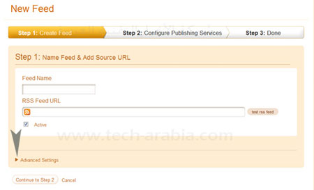 • في المرحلة الأولى اختر اسماً للخلاصة وضع رابط RSS الخاص بموقعك، وهذه هي الإعدادات  الأساسية ويمكنك الاطلاع على الخيارات المتقدمة ضمن تبويب Advanced Settings مثل زمن تحديث الخلاصة ومحتوياتها، والآلية المستخدمة في اختصار عناوين الروابط الطويلة وغيرها من الإعدادات.