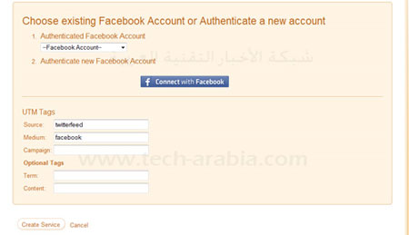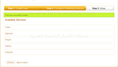 • أخيراً اضغط على Create Service لإنشاء الربط بين خلاصات RSS في موقعك وحسابك في تويتر أو فيسبوك لتبدأ الأخبار الجديدة التي تقوم بنشرها بالتدفق تلقائياً إلى متابعيك في تويتر وأصدقائك على شبكة فيسبوك.