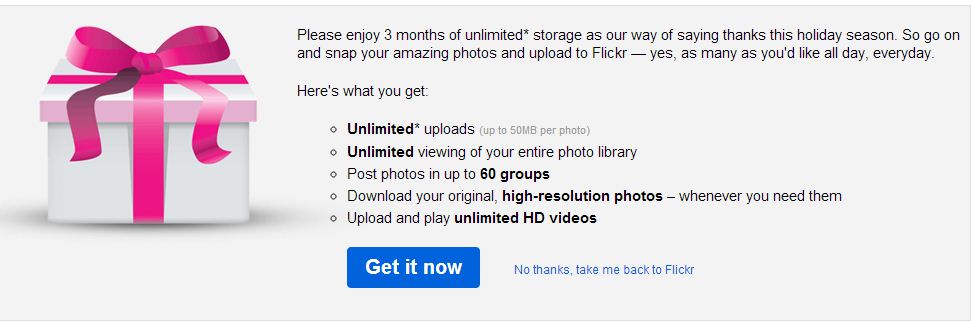 قدمت خدمة تخزين ومشاركة الصور الشهيرة فليكر هدية رأس السنة لمستخدميها عضوية مجانية لفترة ثلاثة أشهر.
